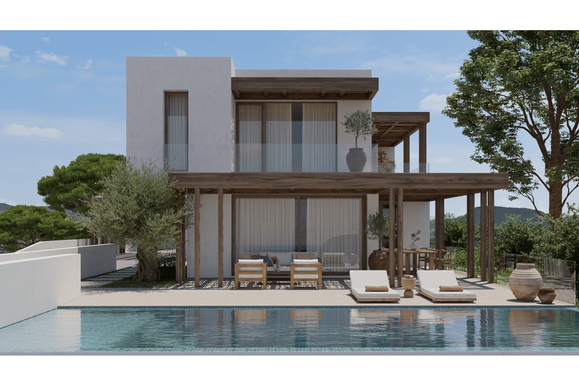 On the ground floor, the villa presents a bright and inviting living area, dining space, and kitchen. It also houses a luxurious master bedroom with an en-suite bathroom and walk-in closet, along with a guest toilet. The seamless flow between indoor and outdoor spaces is enhanced by expansive covered terraces, a private pool, and gardens inspired by Mediterranean beauty.