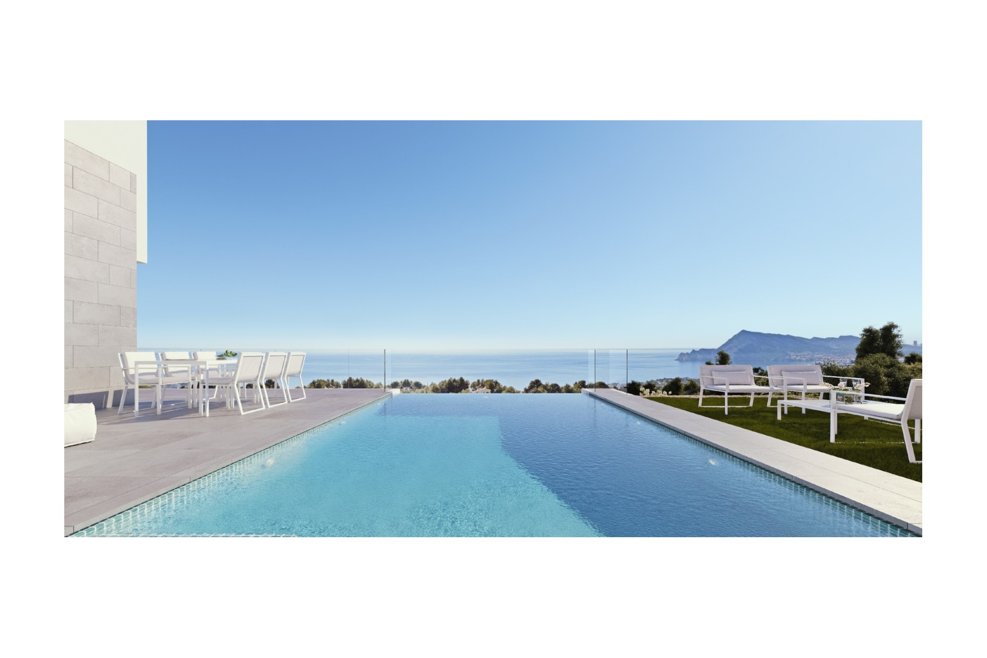 Discover a stunning new minimalist villa in Complex, located in the beautiful region of Alicante, Altea, offering breathtaking sea views and impeccable quality. This exquisite property spans three levels, beginning with the top floor, which features a double garage and an elegant entrance hall that seamlessly connects you to the rest of the home.