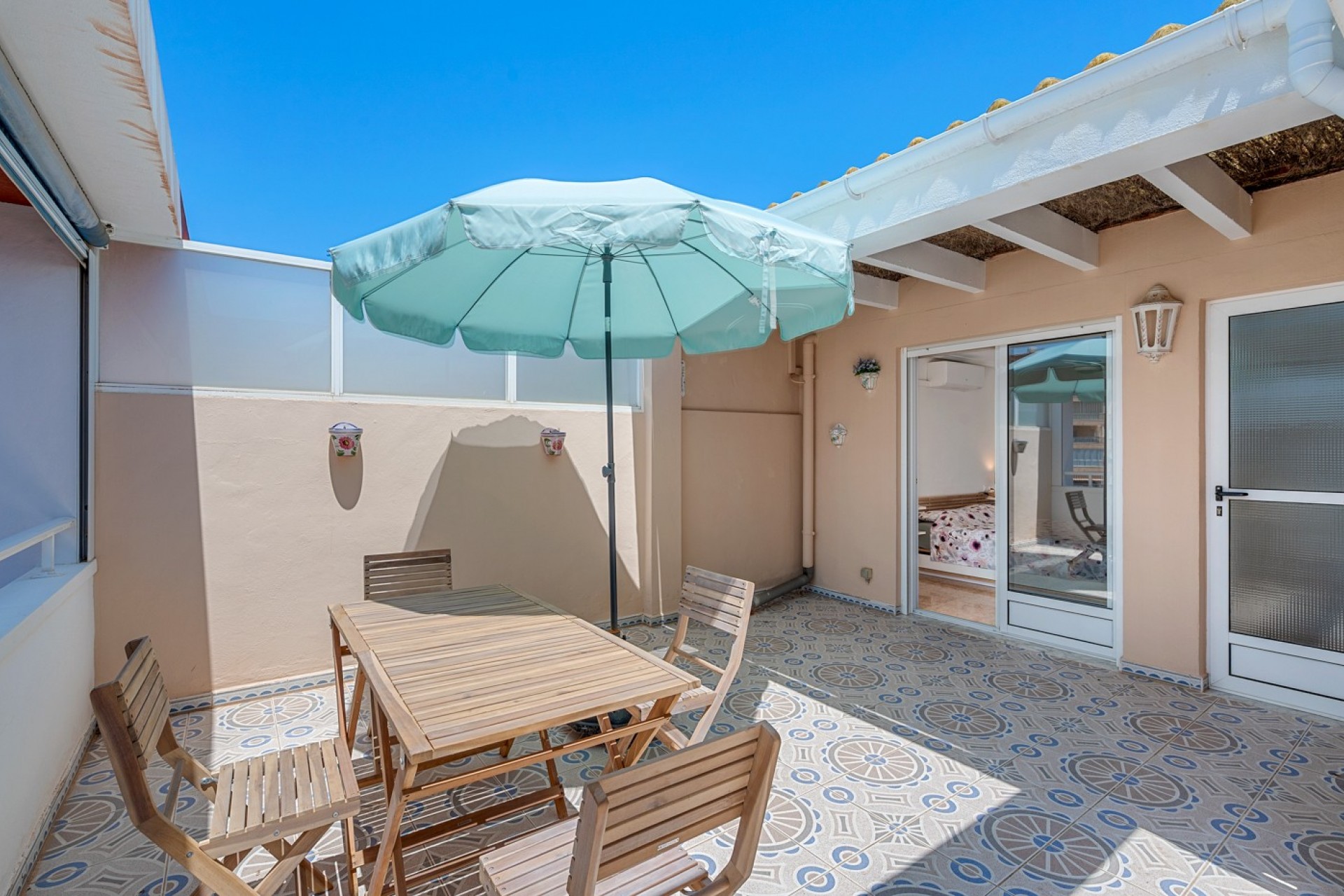 Het ruime, zonnige privéterras met uitzicht op het gemeenschappelijke zwembad is toegankelijk zowel via de slaapkamer op de bovenverdieping als via een aparte ingang.