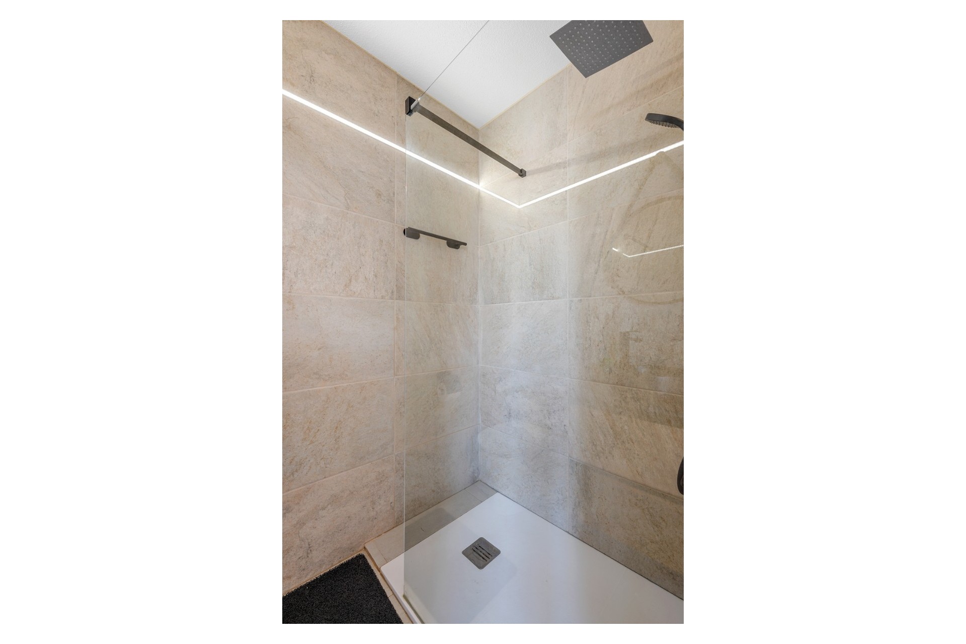 Op de begane grond bevindt zich een comfortabele tweepersoonsslaapkamer met ingebouwde kasten, naast een moderne badkamer met een inloopdouche.