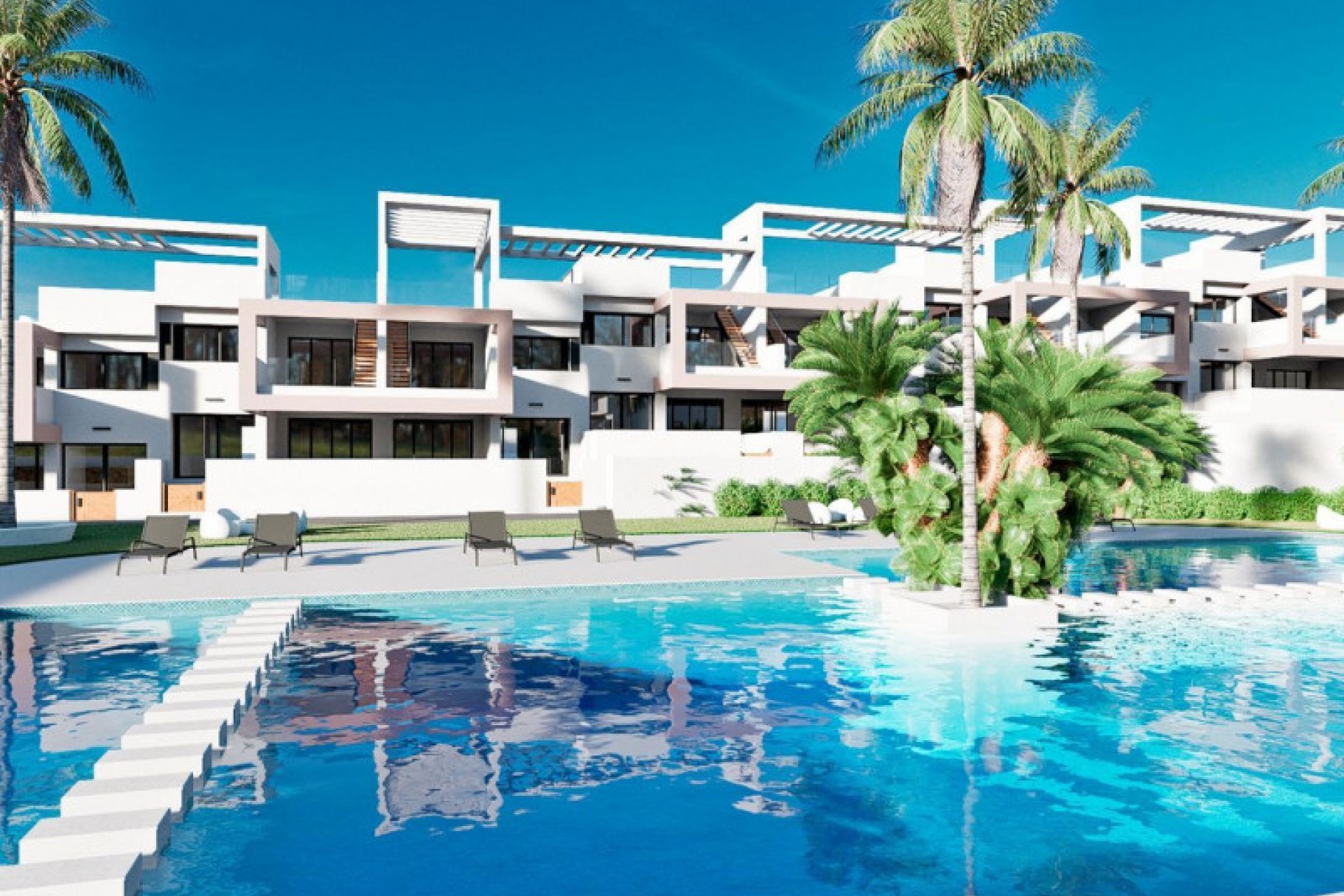 De bungalows op de begane grond zijn zorgvuldig ontworpen, met oppervlakten variërend van 164 m² tot 185 m². Elke woning beschikt over een ruime woonkamer-eetkamer met geïntegreerde keuken, 3 ruime slaapkamers en 2 volledige badkamers. Daarnaast zijn er twee terrassen om van het uitstekende klimaat te genieten. Op de bovenverdieping bieden de bungalows de luxe van een ruim solarium, perfect om te ontspannen en de horizon te bewonderen.